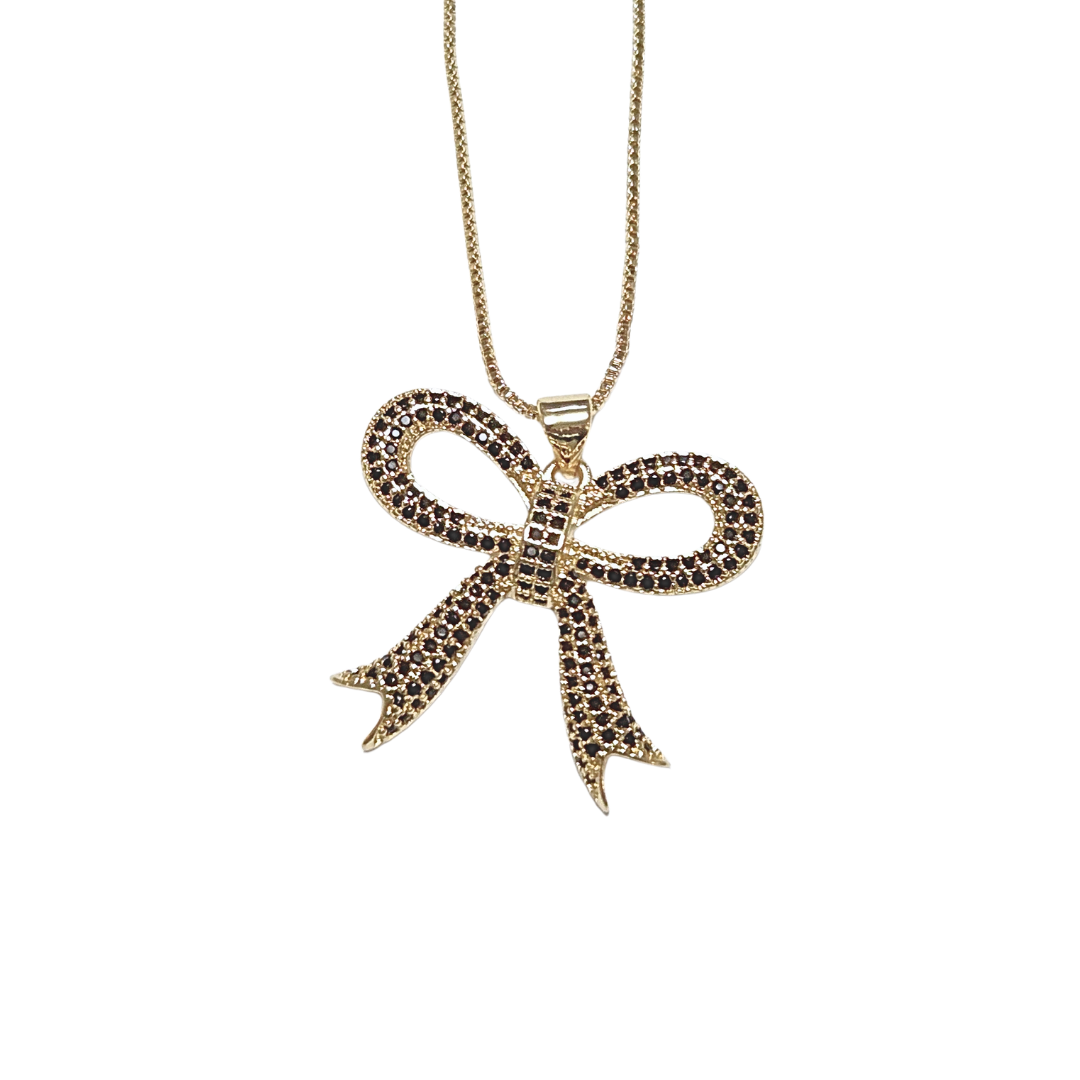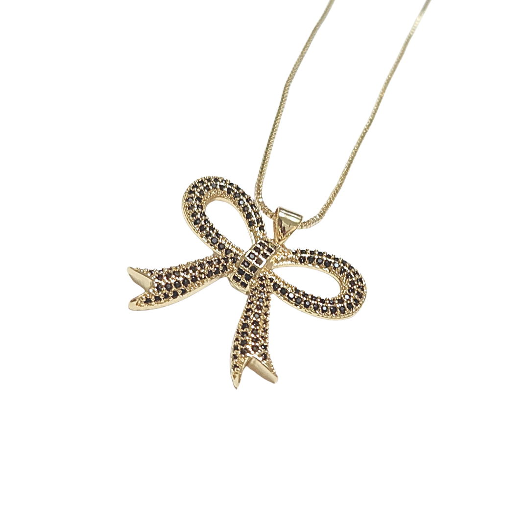 Collar corto de cadena delgada tipo veneciana ajustable con dije grande en forma de moño negro.