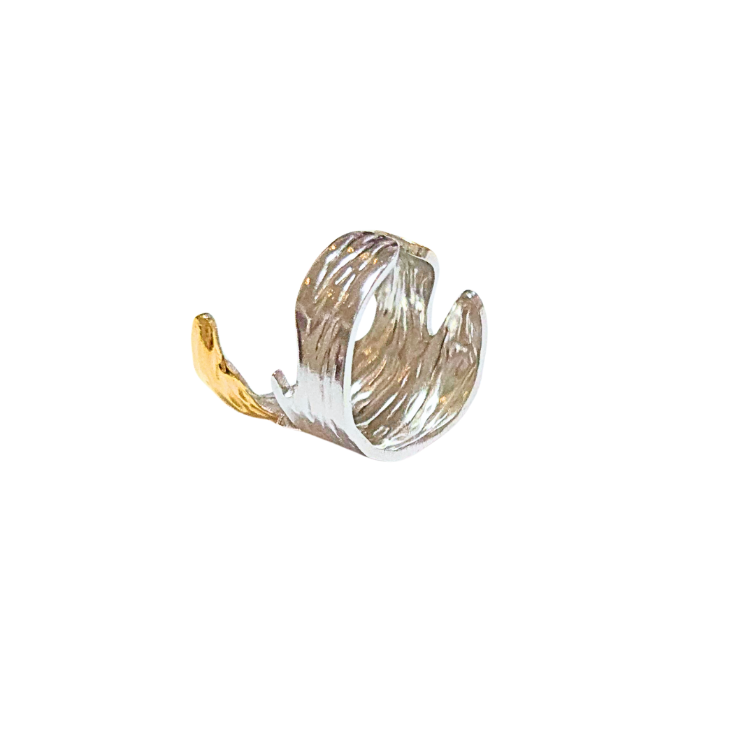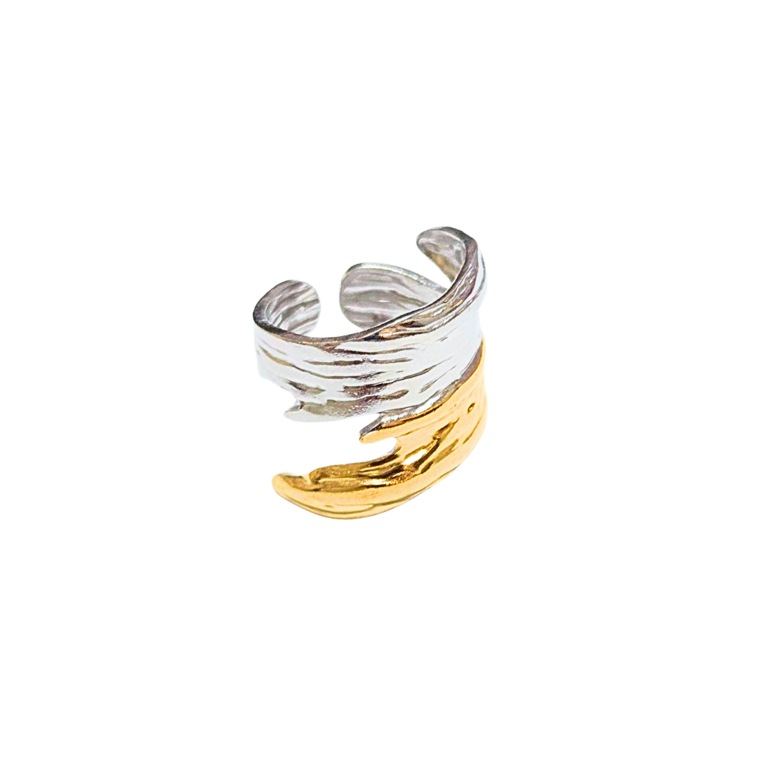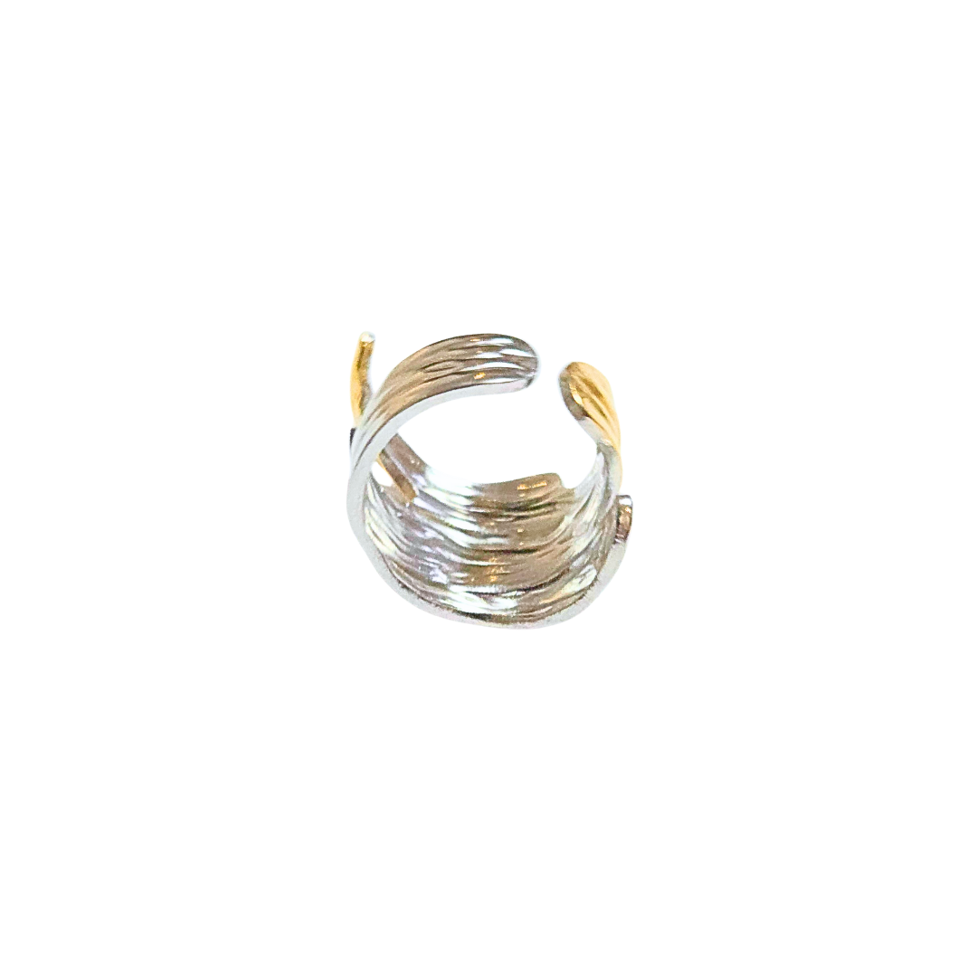 Anillo bicolor ancho y ajustable, tallado como corteza de arbol.